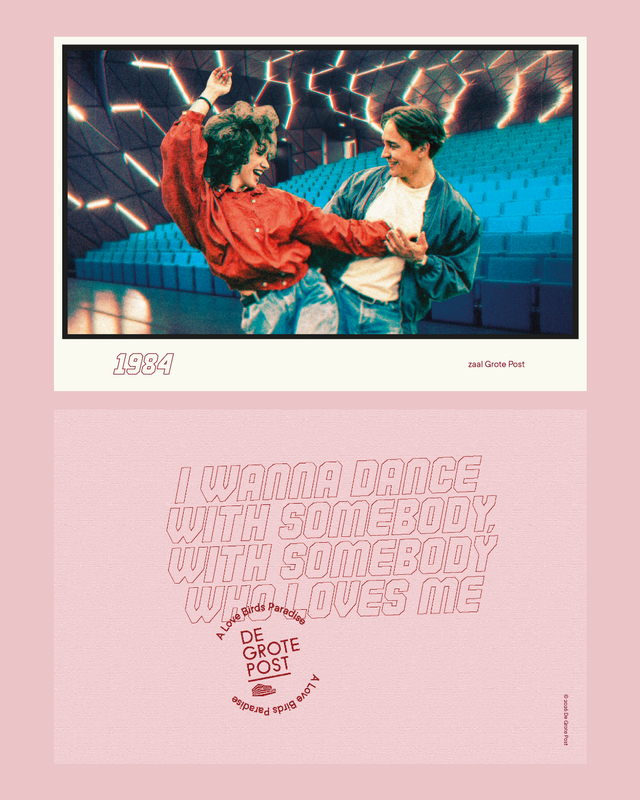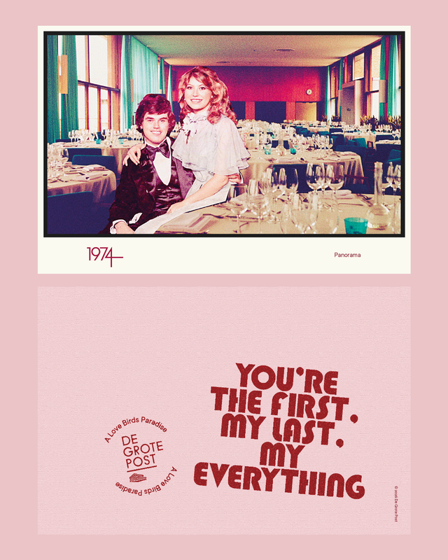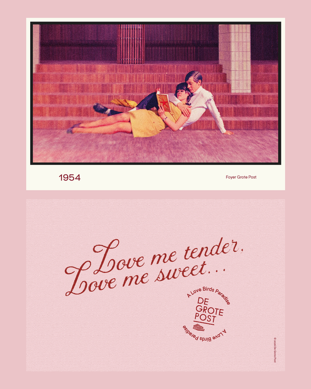 Op de kaartjes zie je retro koppels, gefotografeerd en subtiel gephotoshopt op herkenbare plekken in ons gebouw. Daarbij staat telkens een liefdeslyric uit die periode. Beelden en woorden waarin elke generatie zich op een andere manier kan herkennen.
