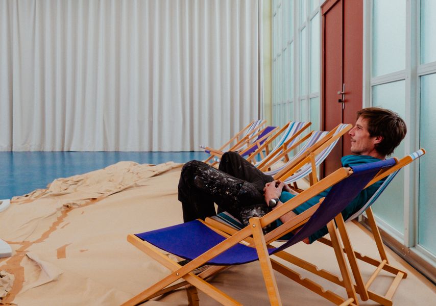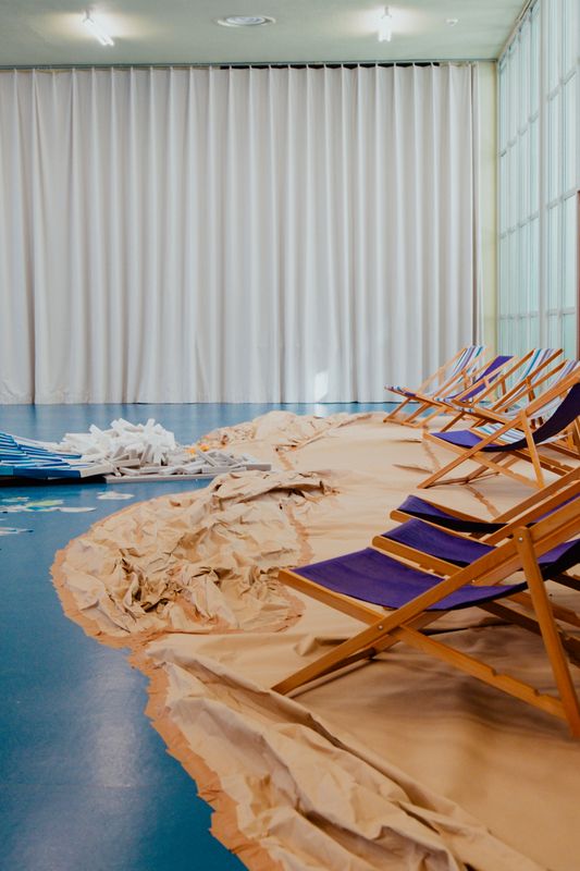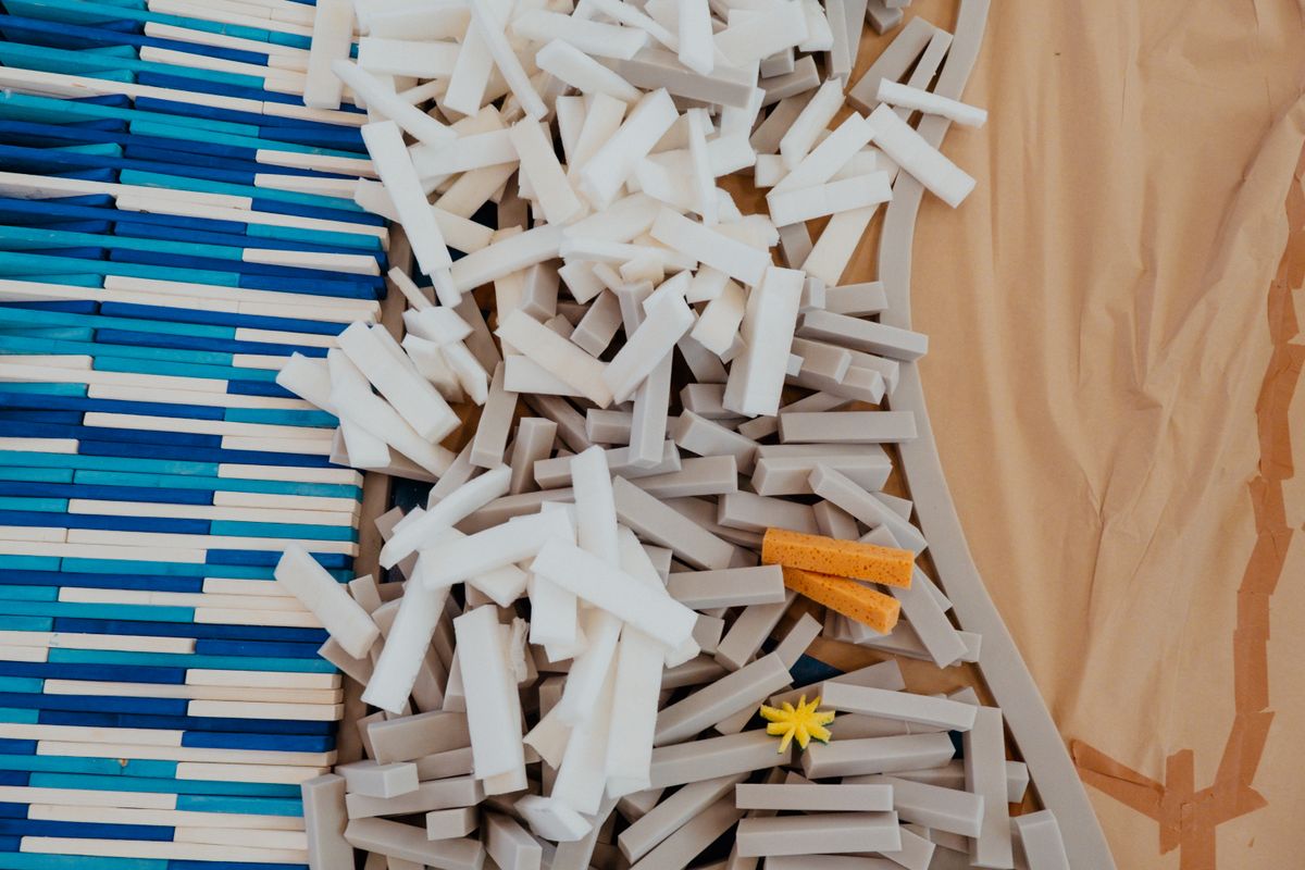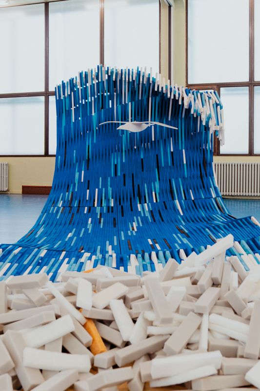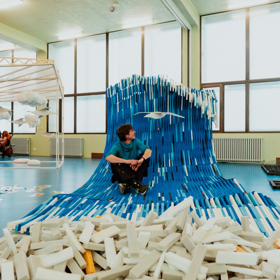 “Mijn passie is hout, dus ik vertrek vanuit dat materiaal als basis”, gaat hij verder. “Verder denk ik ook in textuur: kussens, sponsen, ballonnen …” Materialen die interessant zijn voor jonge kinderen om aan te raken. De onderwaterwereld van Maarten – die de titel De zee kust de kust (met een mond vol vis) kreeg – zal drie werelden tonen: het strand zelf, de wolken en het wateroppervlak en al het leven onder de zee.