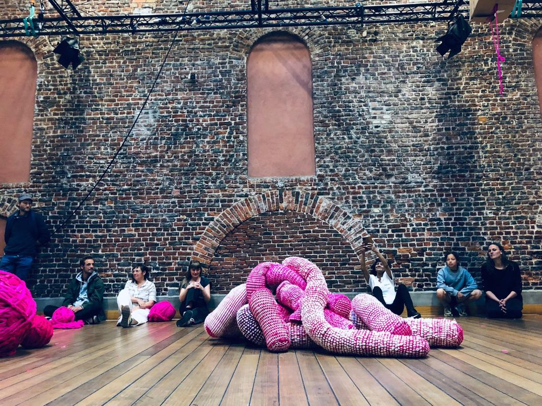 Katrijn “Roze draad is bol geworden, is kostuums geworden, in superveel verschillende vormen. Voor mij gaat het over de samenwerking van Collectief Elan(d) en Manoeuvre. We hebben samen dingen bedacht. I think we need to talk is vooral een cocreatie.”