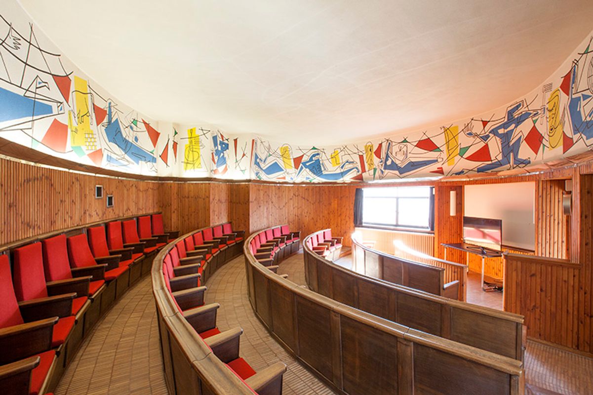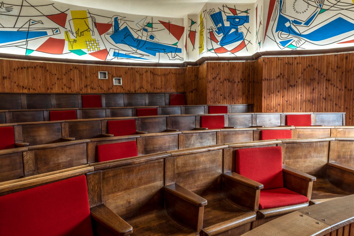 This room was originally set up as the classroom and conference room to provide technical in-service training for postal staff. The still present chalkboard, projection room, the original coat racks and the arrangement of the benches, are the silent witnesses to this.