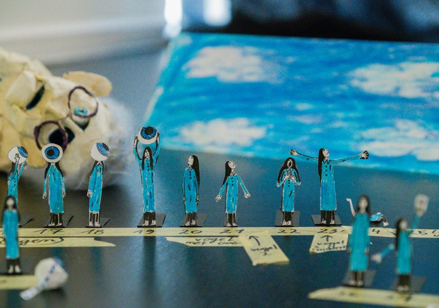 Tijdens haar residentie in De Grote Post onderzocht Stefanie praktisch of ze iets kan maken met veel materiaal, dat toch in een valies past. “Daarom is mijn werk nu kleinschaliger dan normaal. Het is verteltheater met tekeningen, maar ik merk heel hard de behoefte om in 3D te werken, dus ik zoek nu uit hoe ik de tekeningen driedimensionaal kan maken.”