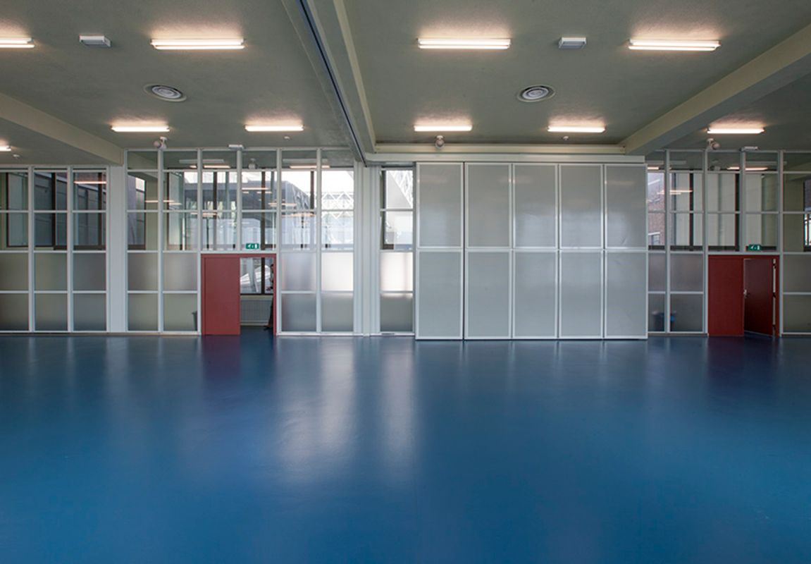 A light-rich room that can be divided into two separate parts with an acoustic wall.